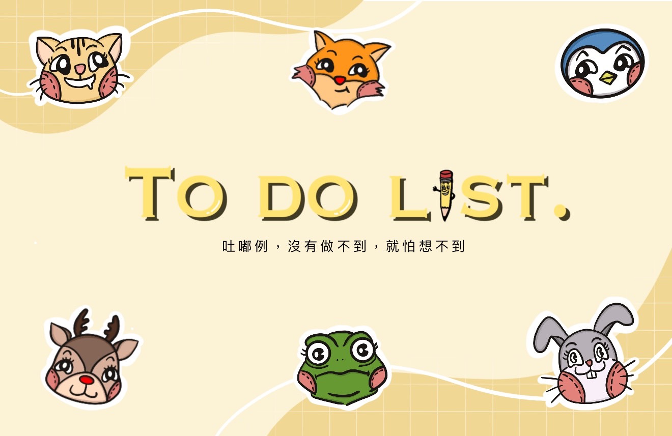 從前有六隻有趣靈魂的動物們,他們有著共同一起幫助大家解決困難的目標,於是組成 To Do List 這個團隊,並研發出便利的網頁供大家使用!每隻動物形象都代表著我們的組員,因為動物比起人更為形象化,讓我們對專題加上自己的元素更有意義!
